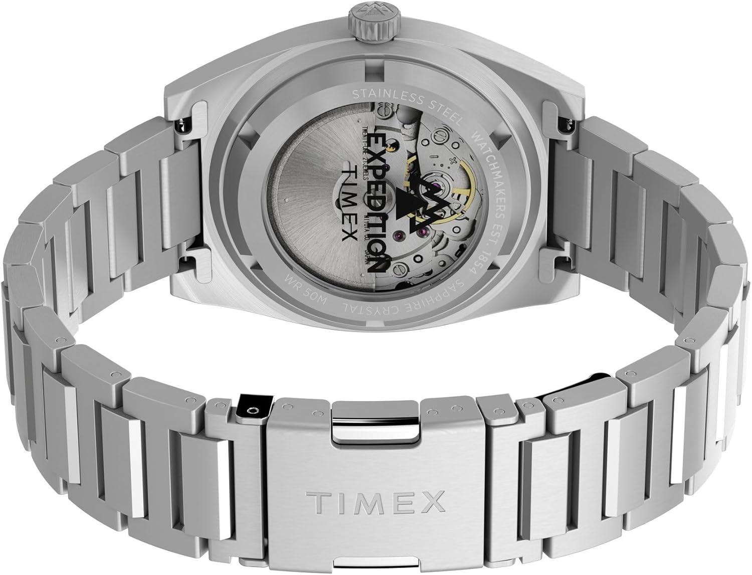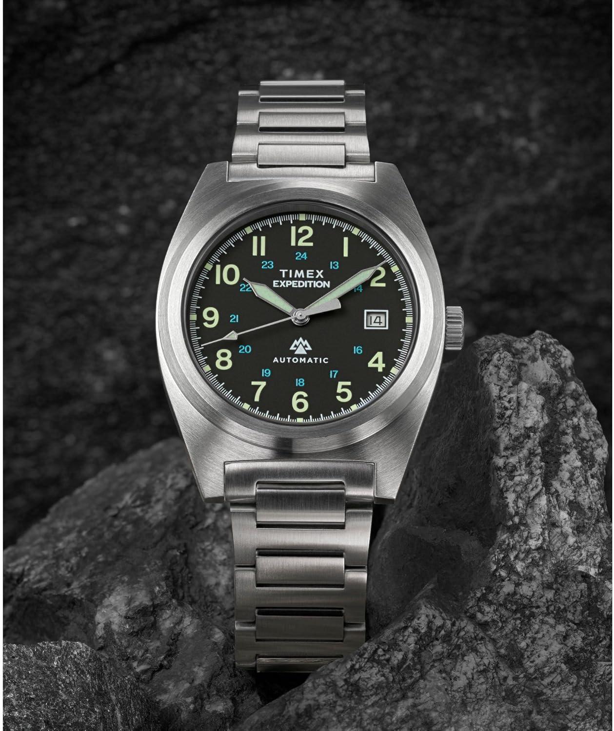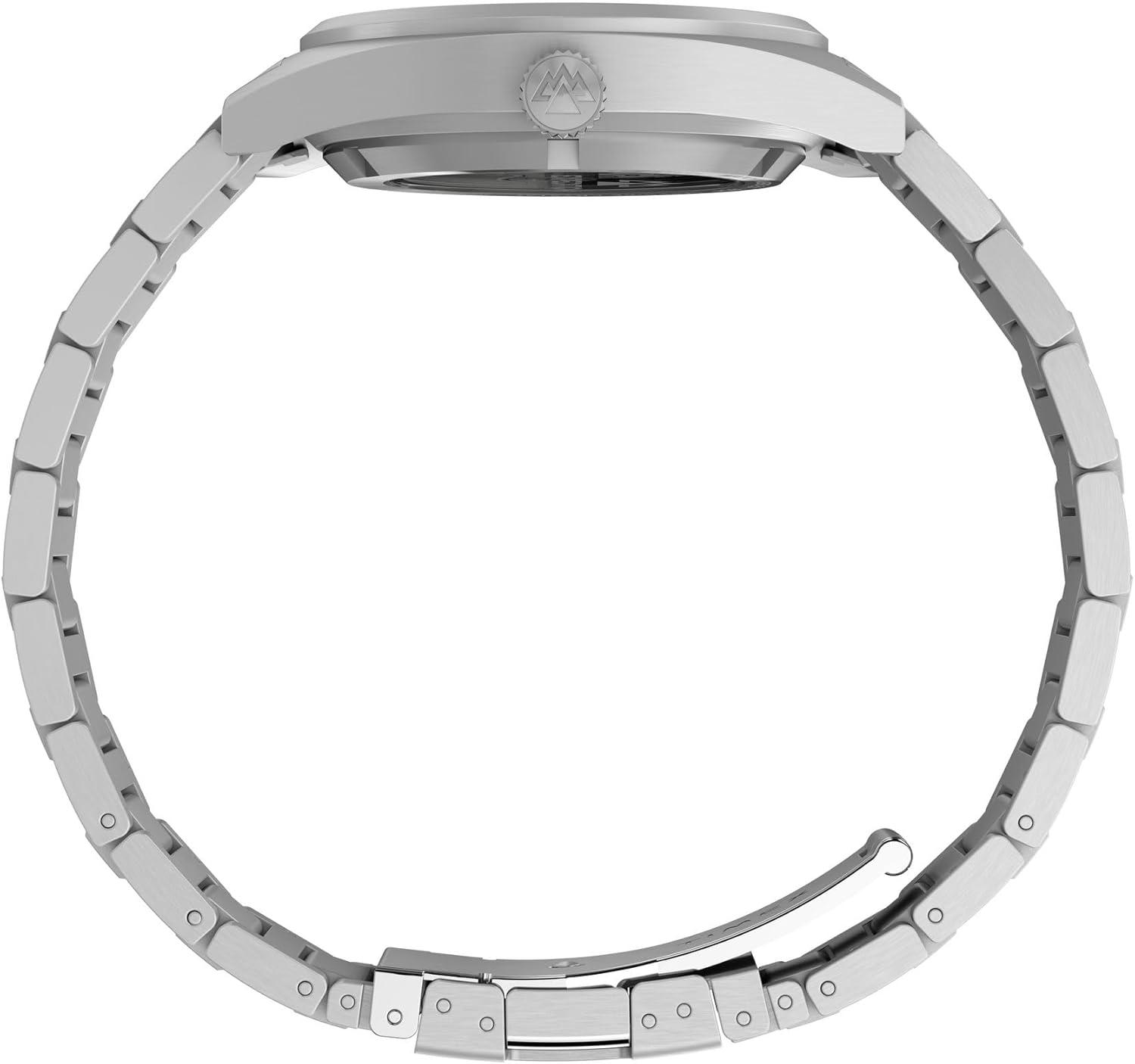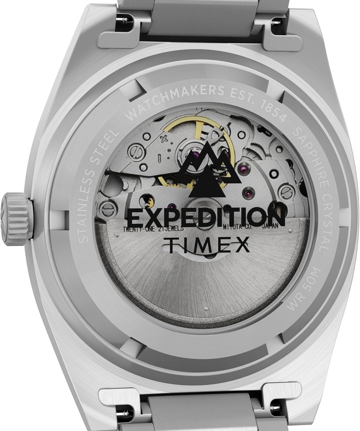 Our Expedition Capstone Automatic brings a new 39mm brushed stainless-steel case to our Expedition collection. The dial is protected by a flat anti-reflective sapphire crystal and includes both 12 and 24-hour time indexes, luminant hands, and a date window beside 3 o'clock. We’ve paired it with a brushed recycled stainless-steel bracelet featuring a fitted end piece near the lugs that creates a seamless transition from case to bracelet. Flip the watch over, and you’ll find an exhibition window that allows for a view of the 21-jewel Japanese automatic movement ticking inside.