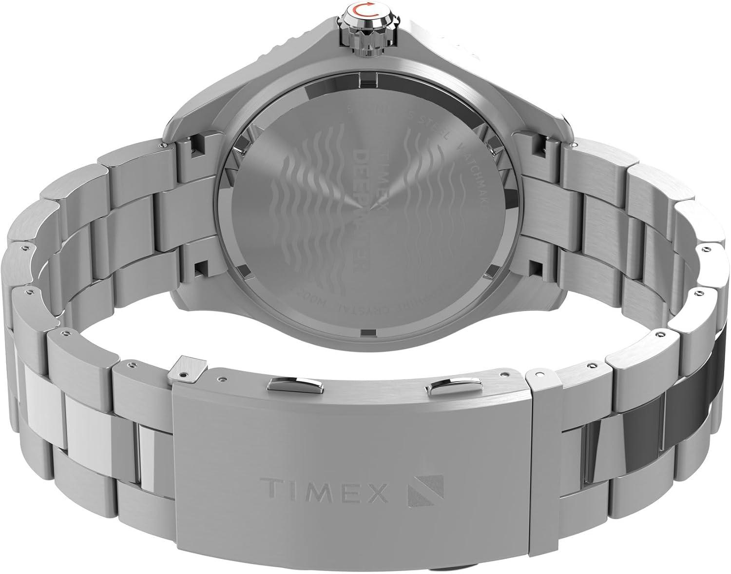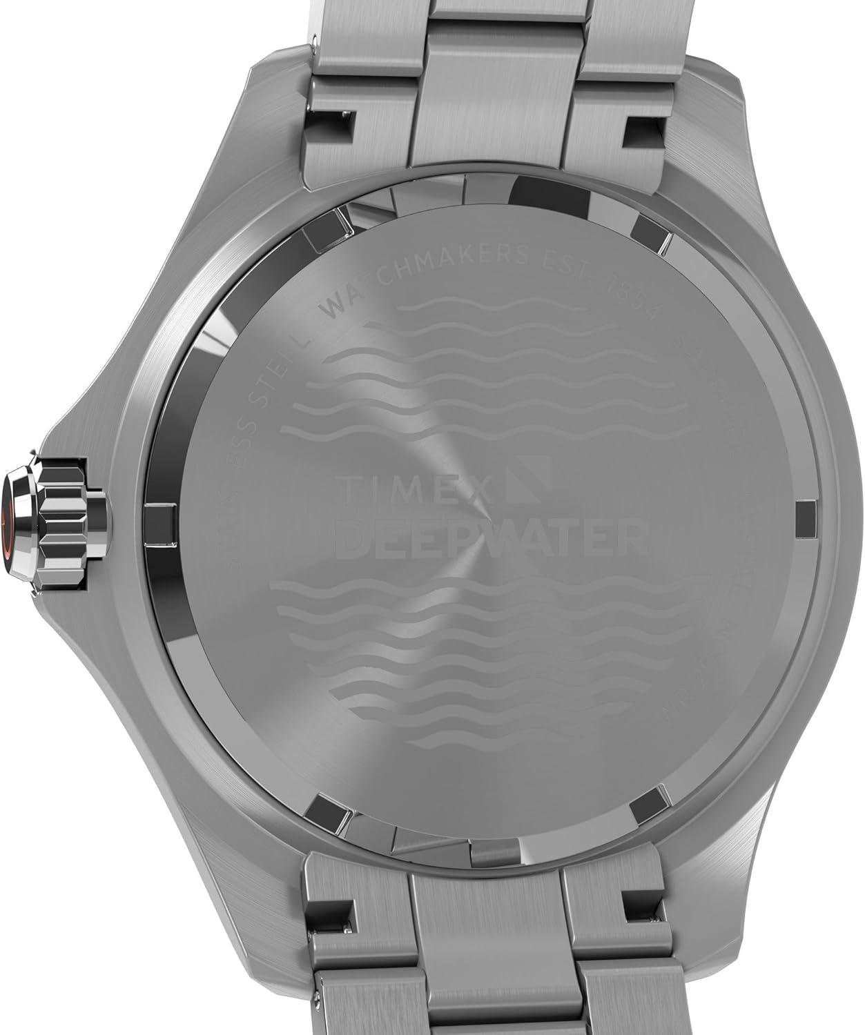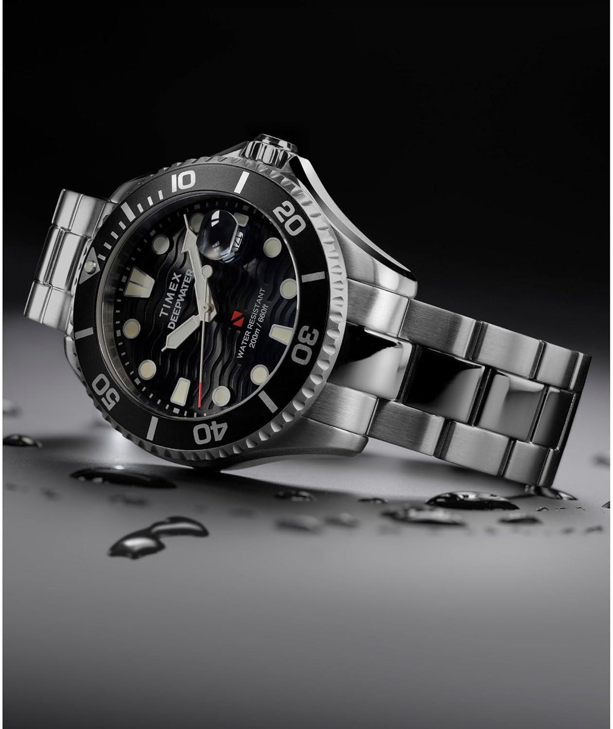 Merging resilience and elegance with crucial functions for underwater pursuits, our Deepwater Meridian 200 is expertly built to venture deeper with a substantial 44mm recycled stainless-steel case. Fortified with a screw-down crown and screw-on case back that effectively keep water out, its robust construction is expertly engineered to withstand water pressures of up to 20 atmospheres and provides 200m of water resistance. This watch is powered by a reliable quartz movement, and we’ve equipped it with a sapphire crystal with anti-reflective coating, a sturdy crown protector, a magnified date window, a unidirectional ratcheting top ring, and Super-Luminova® hands and hour markers providing the luminosity you rely on as you venture below. A unique wave pattern brings dimension to the blue or black dial, while the brushed and polished recycled stainless-steel bracelet is equipped with an extender that allows for a looser fit over your wet suit.