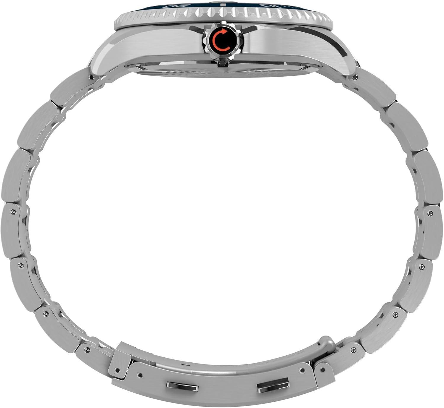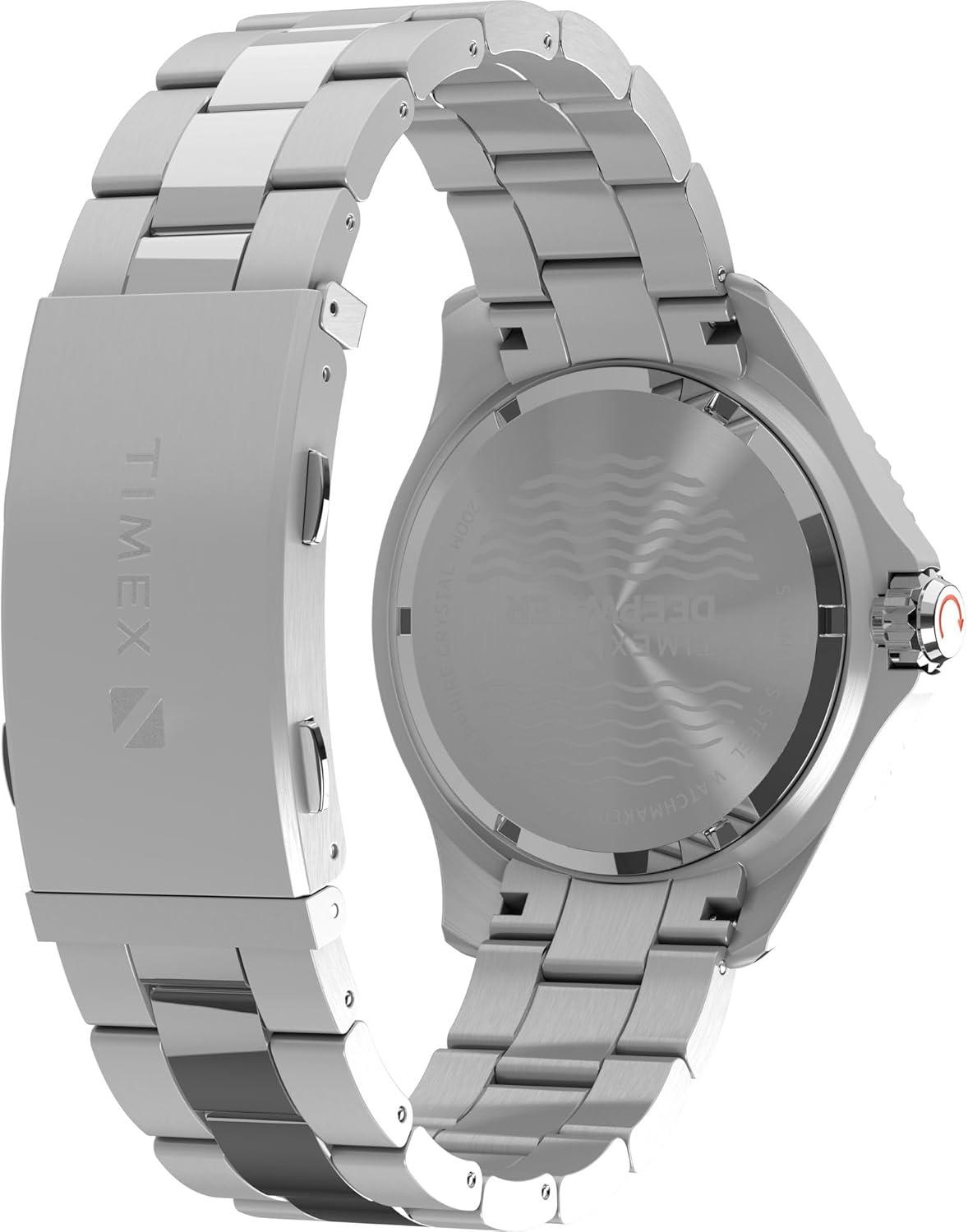 Merging resilience and elegance with crucial functions for underwater pursuits, our Deepwater Meridian 200 is expertly built to venture deeper with a substantial 44mm recycled stainless-steel case. Fortified with a screw-down crown and screw-on case back that effectively keep water out, its robust construction is expertly engineered to withstand water pressures of up to 20 atmospheres and provides 200m of water resistance. This watch is powered by a reliable quartz movement, and we’ve equipped it with a sapphire crystal with anti-reflective coating, a sturdy crown protector, a magnified date window, a unidirectional ratcheting top ring, and Super-Luminova® hands and hour markers providing the luminosity you rely on as you venture below. A unique wave pattern brings dimension to the blue or black dial, while the brushed and polished recycled stainless-steel bracelet is equipped with an extender that allows for a looser fit over your wet suit.