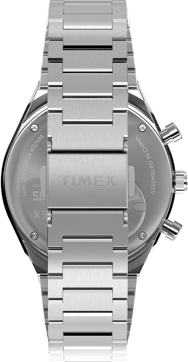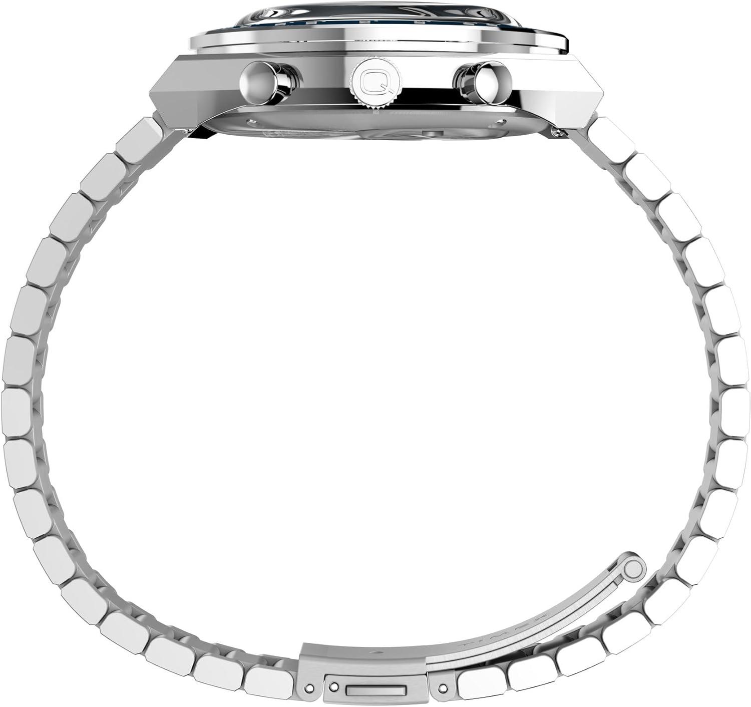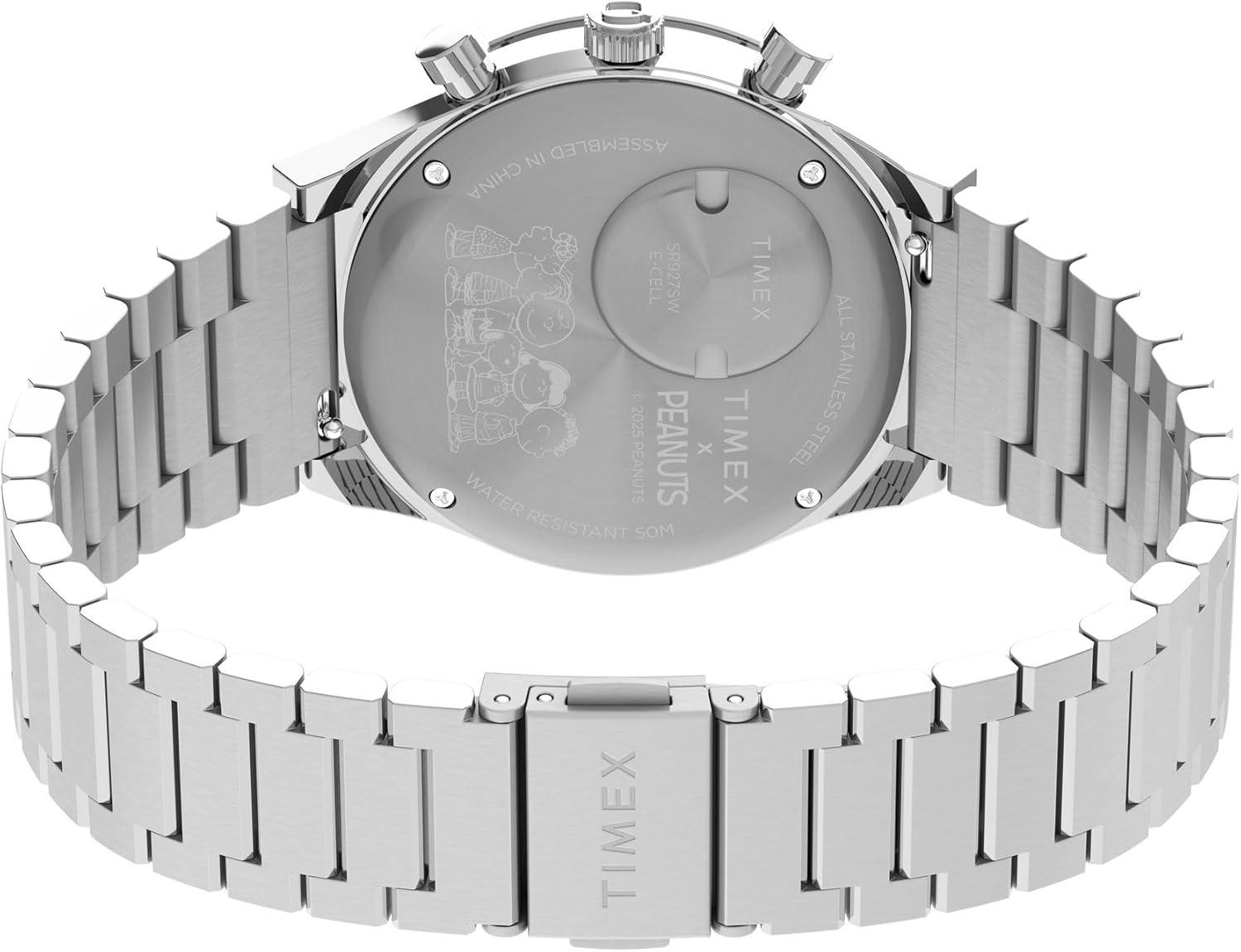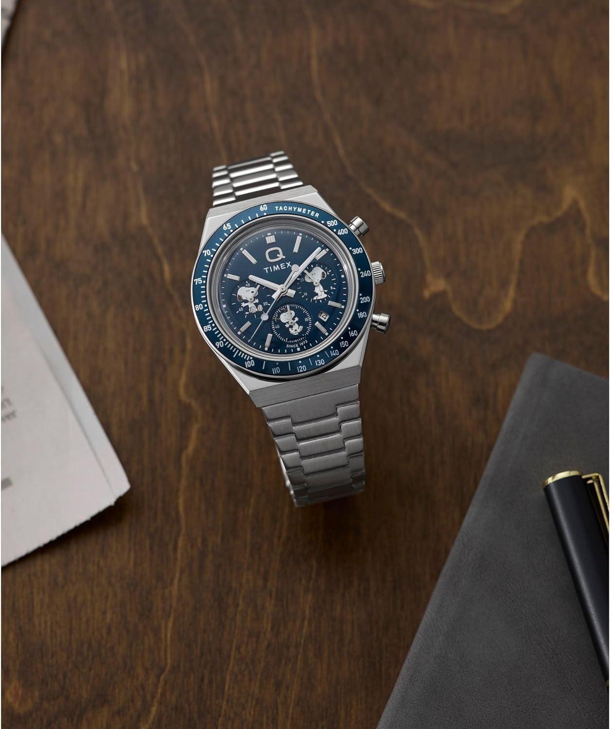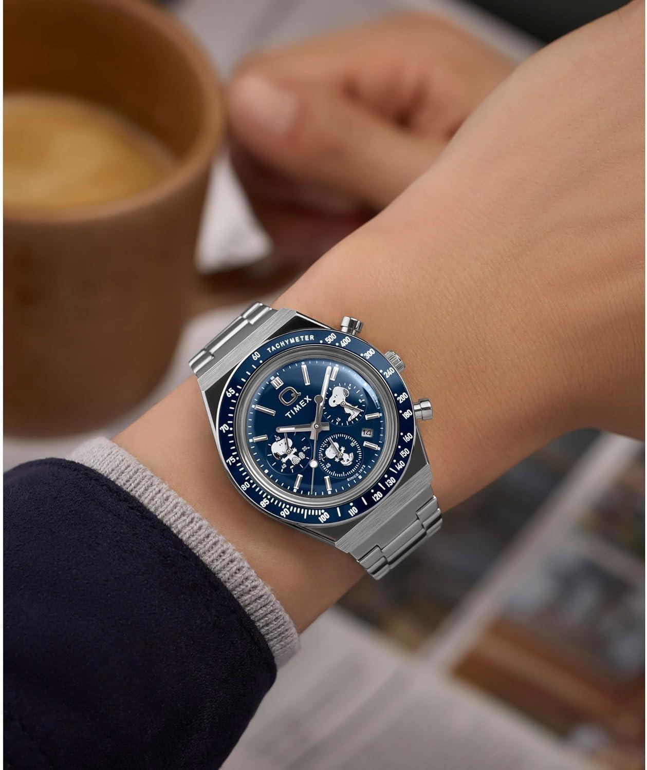 Your favorite beagle makes an unexpected appearance on the sub-dials of our high-performing Q Timex Chronograph. This timepiece celebrates the endurance of our legendary 1970s Q Timex, equipped with an ultra-precise chronograph movement and tachymeter bezel for determining elapsed time and average speed like the greatest daredevils in motorsports. A date feature, hand-applied dimensional indices, and an updated Q Timex logo stand beautifully against a deep blue dial, while a brushed recycled stainless-steel bracelet with quick-release spring bars, stainless-steel crown, and brushed and polished 40mm recycled stainless-steel case bring dynamism and durability to its retro construction.
