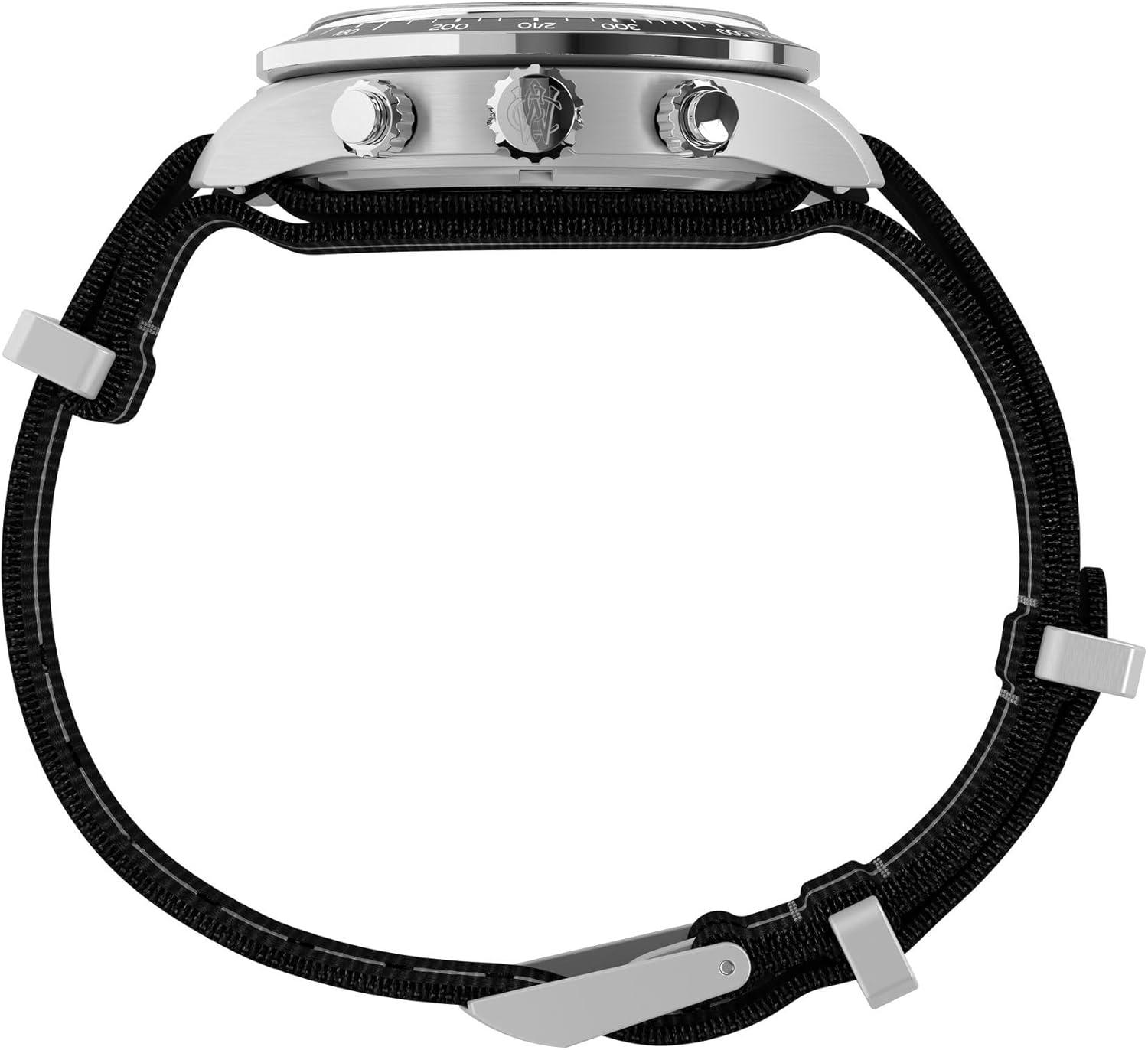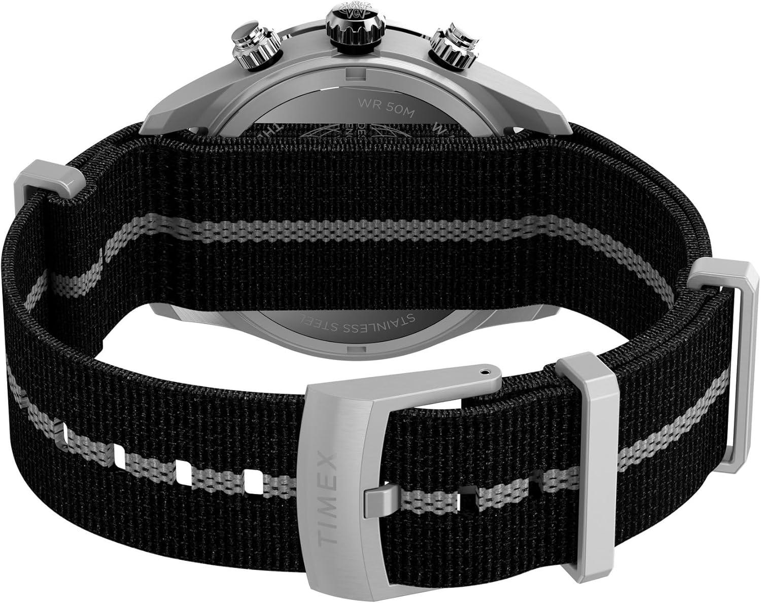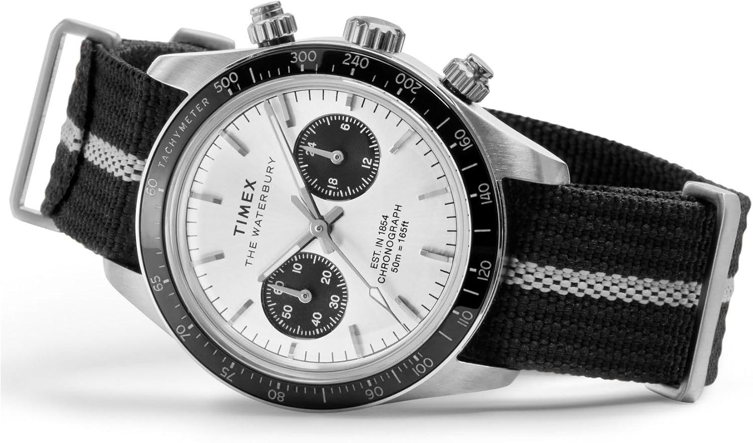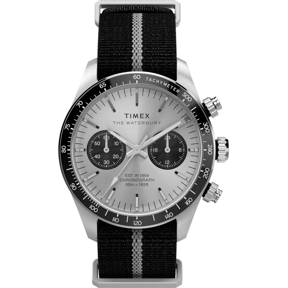 The Waterbury Heritage Chronograph combines modern functionality with timeless design, featuring a chronograph to track elapsed time and a black tachymeter bezel for determining average speed. Complementing its 39mm brushed recycled stainless-steel case is a striped recycled fabric strap that channels the effortless tailoring of classic American menswear. Double-layered for durability and designed with convenient slip-thru construction for easy on and off, it delivers a laid-back confidence on the wrist. The silver-tone dial is accented by contrasting sub-dials and safeguarded by an anti-reflective mineral glass crystal for enhanced clarity. Luminant hands ensure visibility in lowlight conditions, while applied indices and intricate detailing on the crown and pushers add a refined touch.