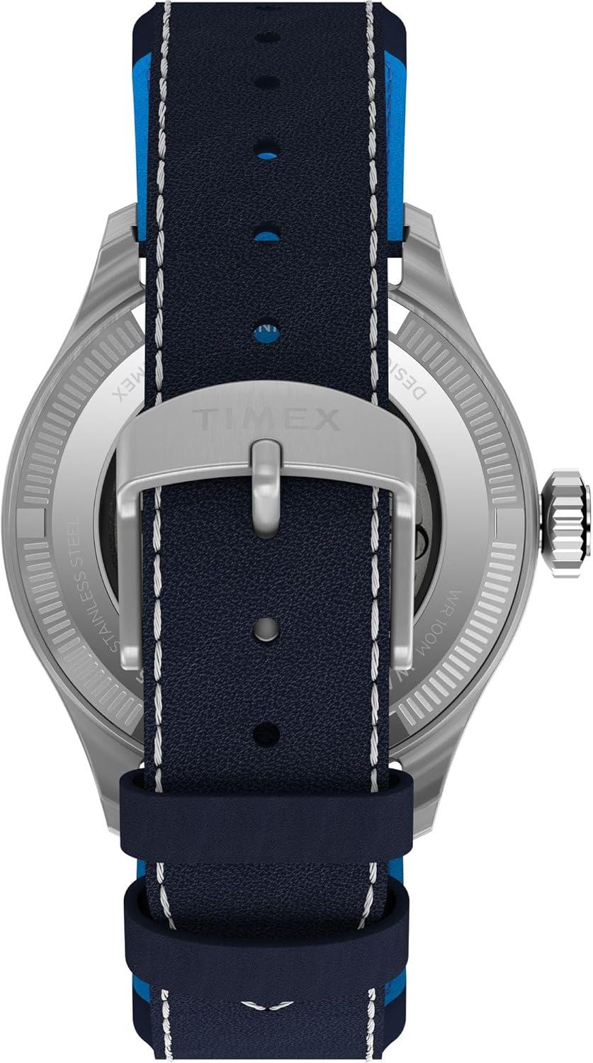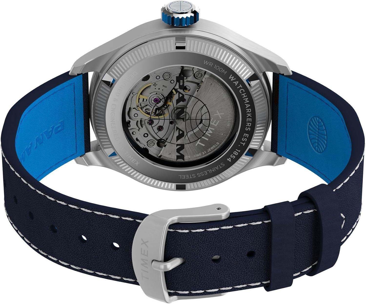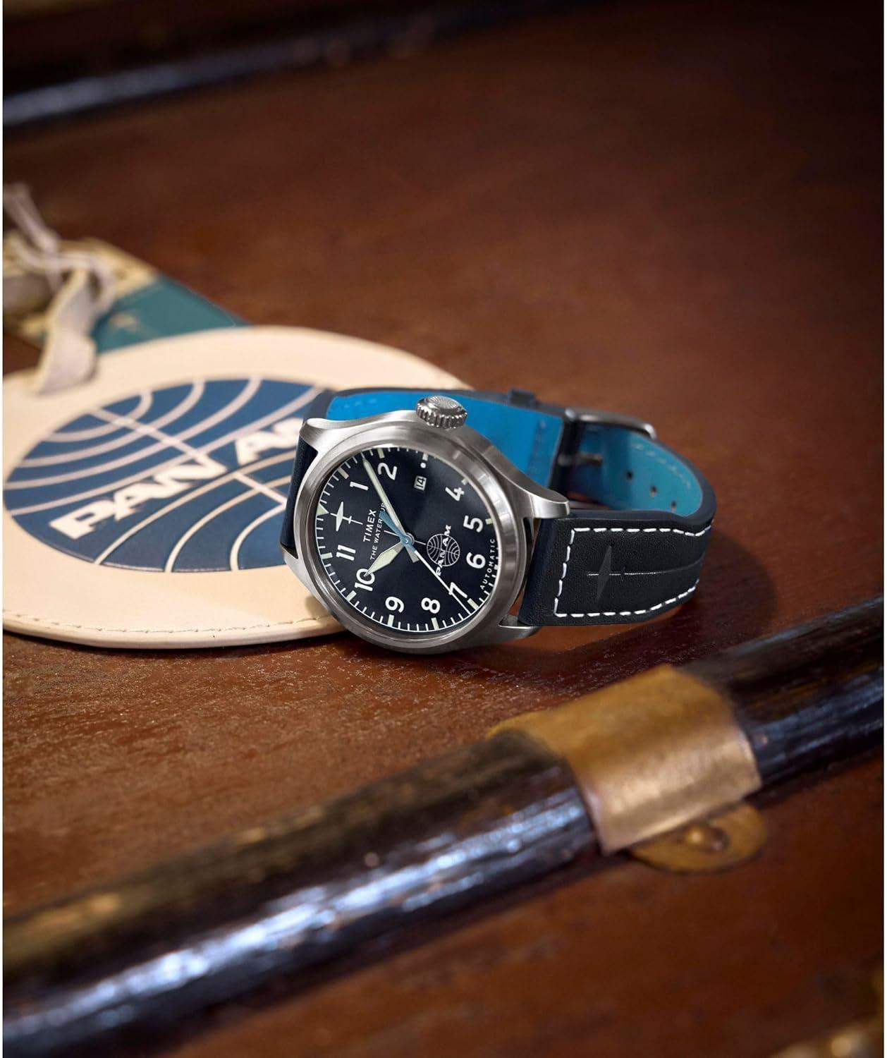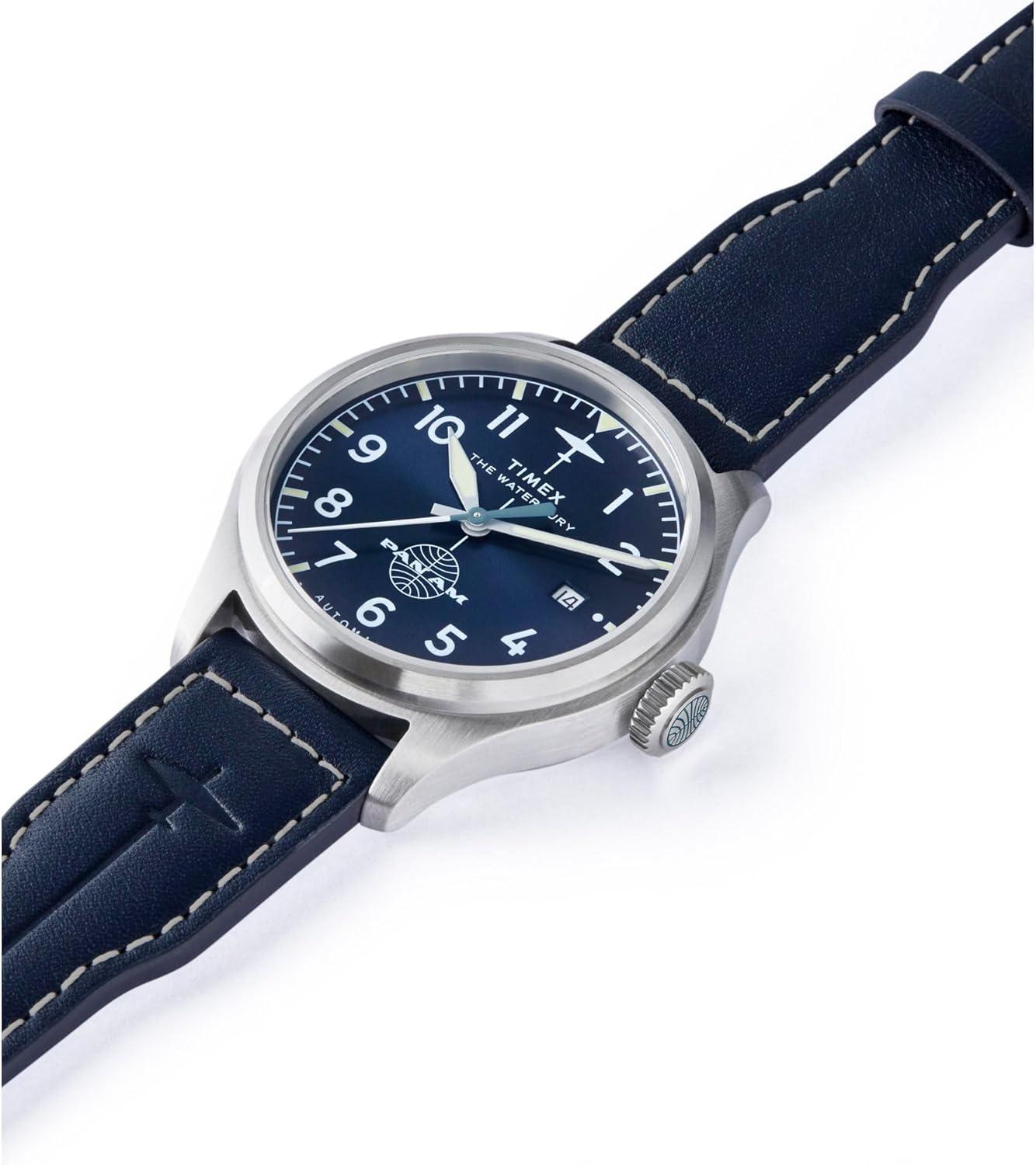 Our latest Pan Am offering captures the spirit of the golden age of aviation. It brings a new 41mm brushed recycled stainless-steel case to our Waterbury collection, as well as the first automatic watch to join our ongoing collaboration with Pan Am. It presents the clean, military-style design of a traditional pilot watch, and it’s powered by a 21-jewel Japanese automatic. It proudly features a sapphire crystal with anti-reflective coating, luminant hands and markers, a date feature, and an impressionist airplane motif on the blue sunray dial. This same airplane appears on the sustainably tanned natural leather strap from the Leather Working Group (LWG), complete with contrast stitching, iconic Pan Am blue lining, and quick-release spring bars for easy strap changes without the need for tools.